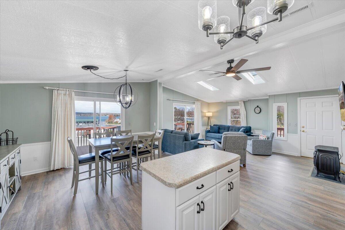 A gas fireplace creates a warm gathering space while double sliding doors lead to the large lakeside deck perfect for entertaining or relaxing while enjoying lake views.