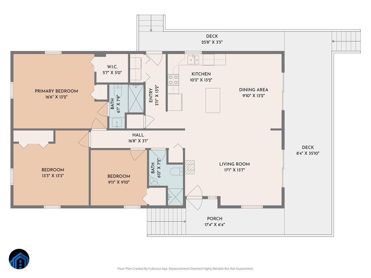 The private primary suite is separated from two additional guest bedrooms and a full guest bathroom.